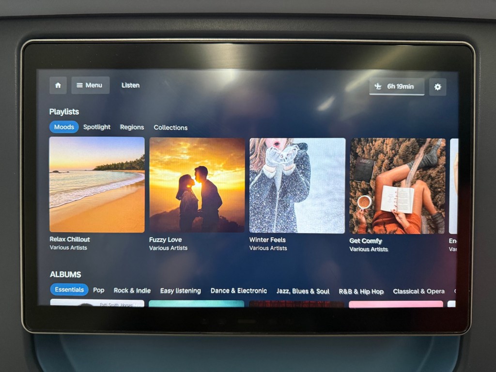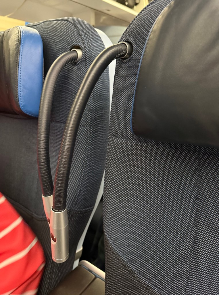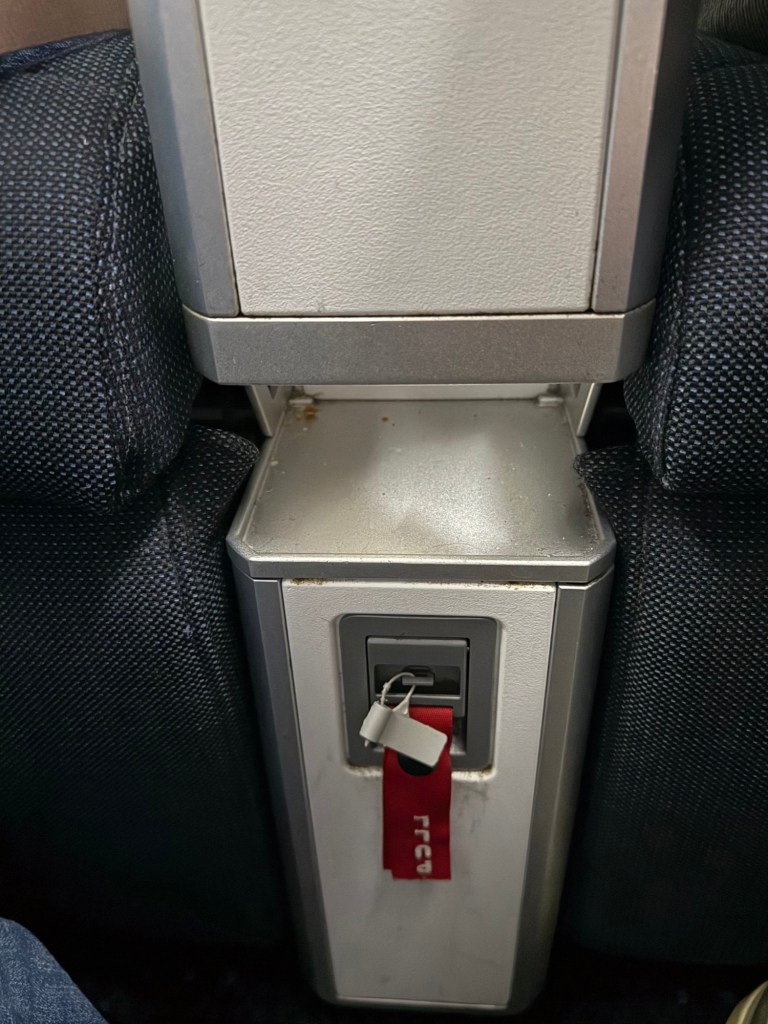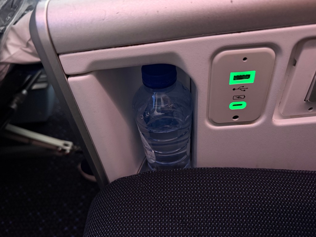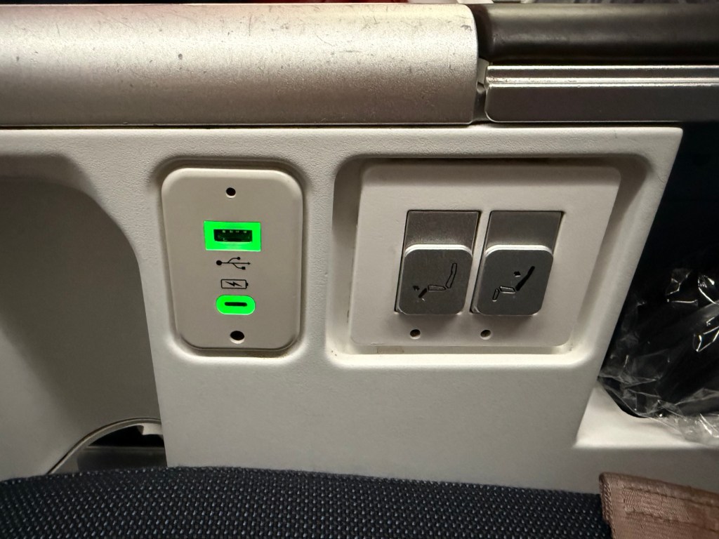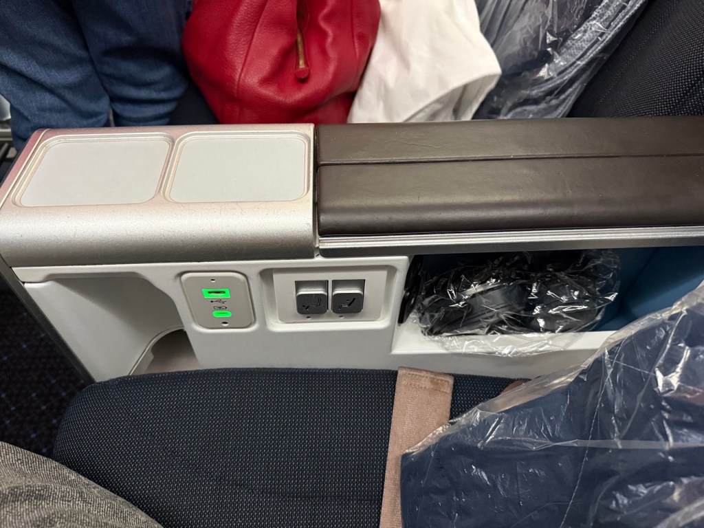 The center armrest has, from front to back, an opening to store a bottle of water; USB-A and USB-C plugs, two buttons that control the leg rest and the recline; a storage compartment that held the headphones, but also had the headphone jacks to the front of it and then at the back a universal power plug. While the location of the plugs are a little hard to reach, I thought they were practical overall: once you succeed in plugging in any chargers or cables, you can leave your phone and such in the storage compartment, so that wires don’t get in the way of anything.