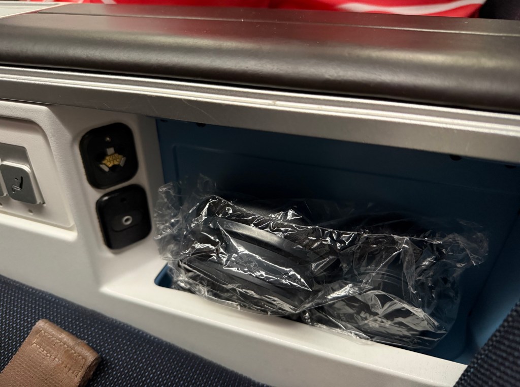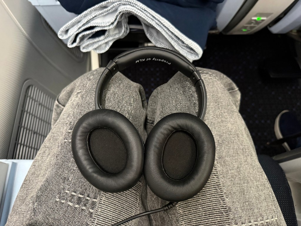 Ina. storage compartment on the right side were noise canceling headphones in a plastic wrapper. I removed the wrapper to reveal the headphones, which feature KLM branding I believe these are the same headphones as in KLM’s business class. They were quite tight, but didn’t cause discomfort after prolonged use and the noise cancelation was quite noticeable as well.