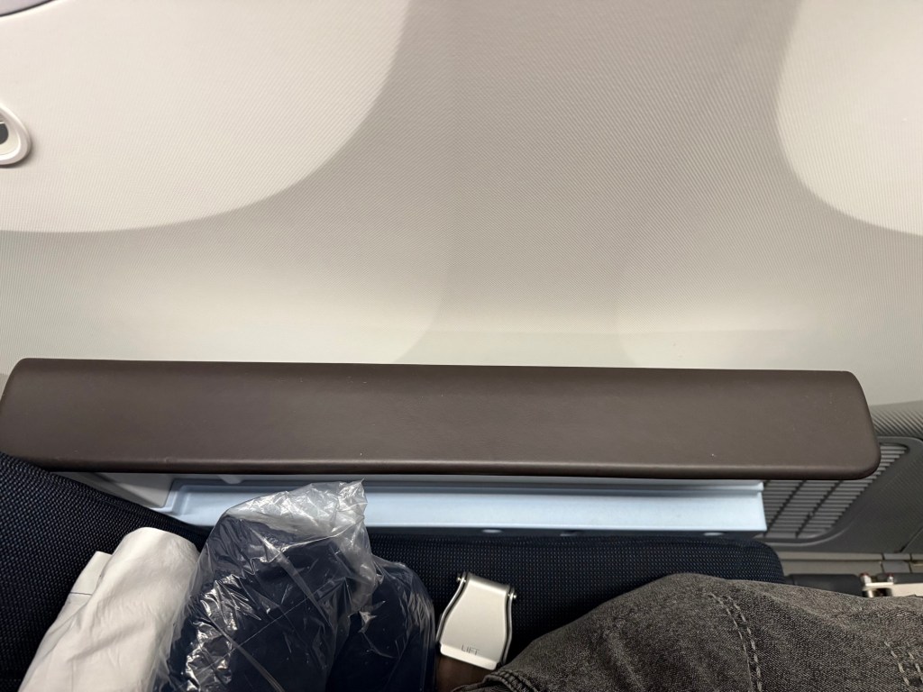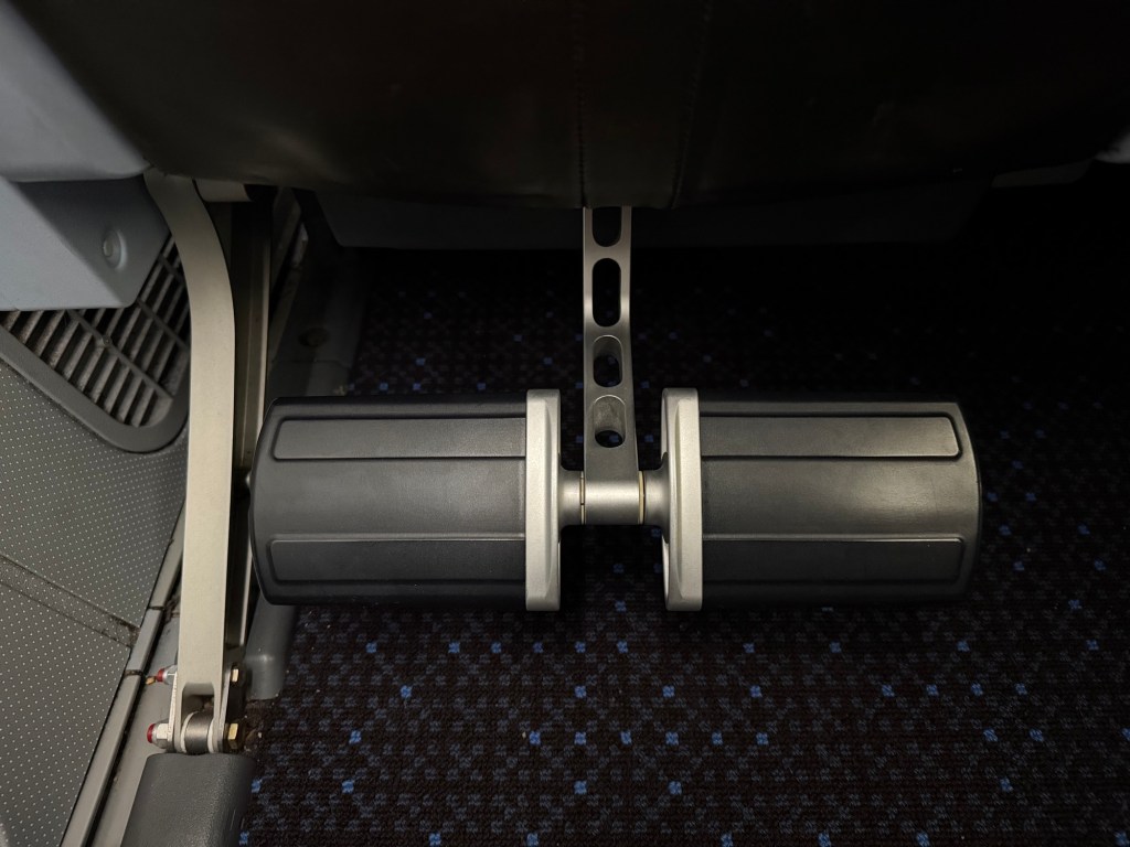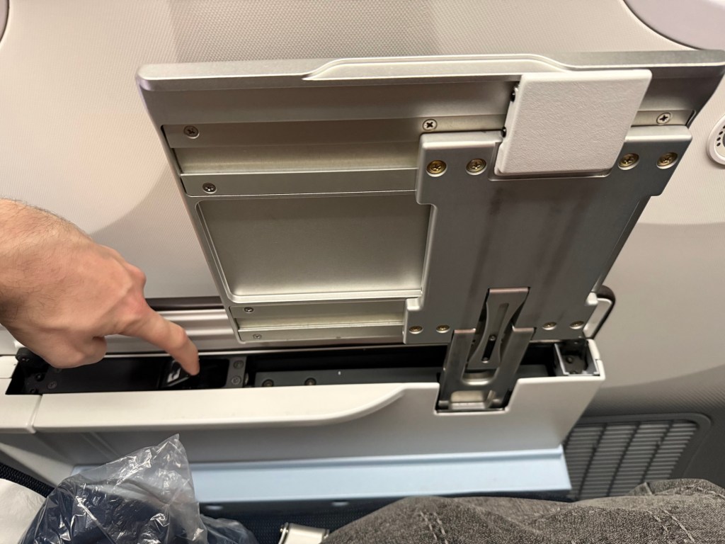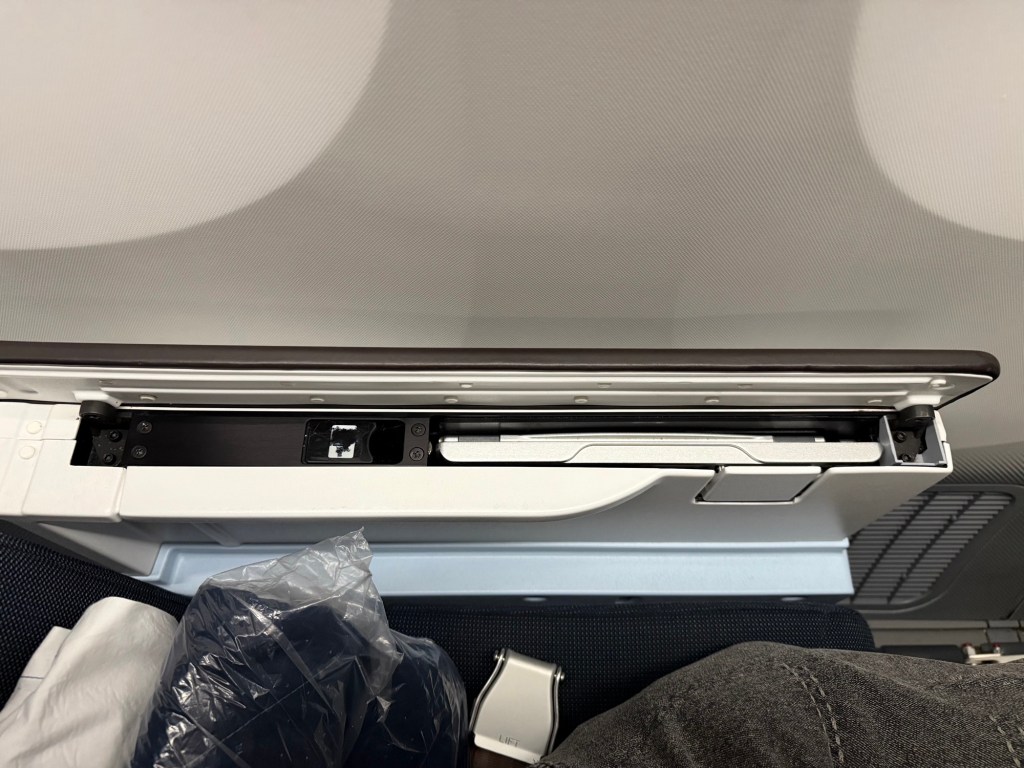 Below the entertainment monitor is a small pocket. I thought this was very useful to store things you’d want to keep in easy reach, such as chargers and cables. Keeping it here means you don’t need to reach all the way to the lower seat pocket, which already includes an inflight magazine, safety instructions and more of the usual items. Then, all the way below, is the footrest that you can extent from the seat in front.
