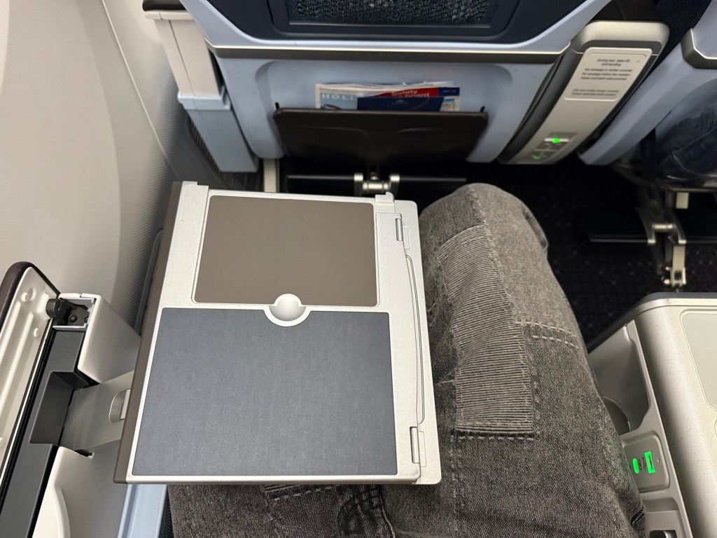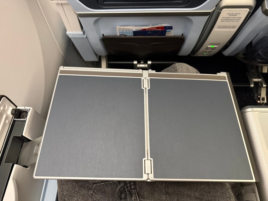 As for the tray table, it pops out of the armrest that is on the window side if you’re on the window, or otherwise it’ll pop out of the aisle-side armrest. You flip open the armrest, at which point you’ll see the table in there. You pop it out by pulling on a little tab just aft of the table, at which point the table quite literally shoots out of the armrest – I was a little startled the first time! Then, fold it down, and then you can fold it open to reveal the full table. The strange grey area you see at the top of both the half and full tray table is a special material that’s a little rubbery, so that glasses or the tray table have some grip. A very practical innovation!