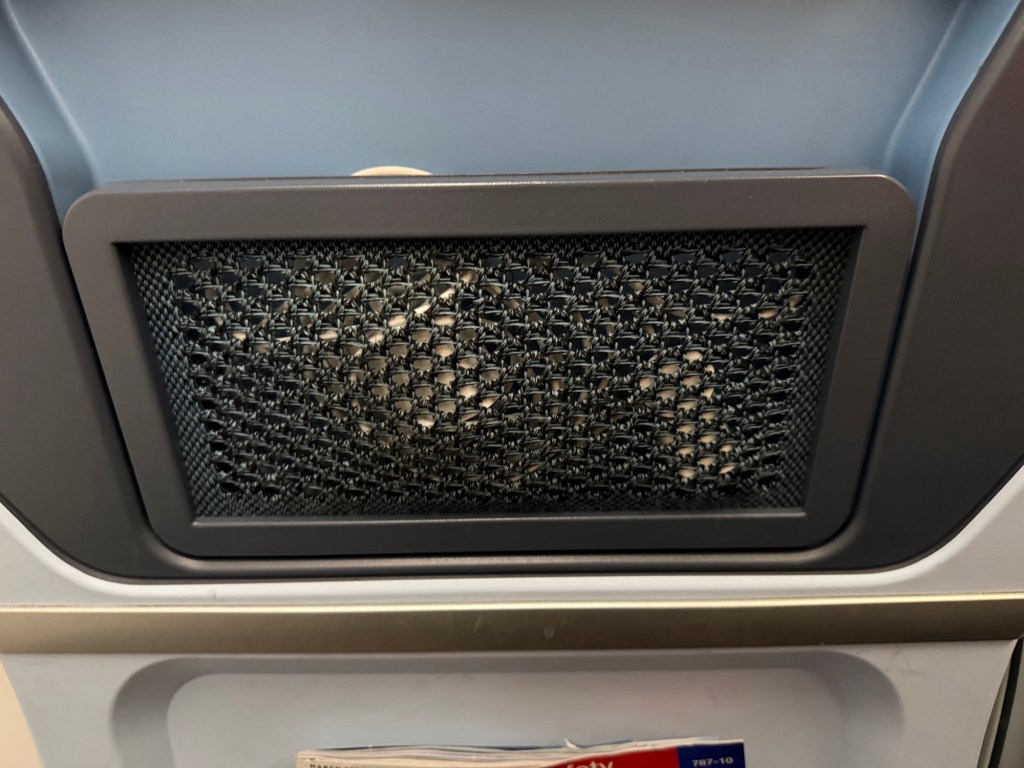 In the seat back of the seat in front you’ll find a 13’3″ monitor, which is bigger than economy class but does feel a little smallish compared to some of the newer seats out there these days. Right below that is a little pocket to store stuff in, and then below that is the ‘true’ seat back pocket as you’d also encounter in economy.
