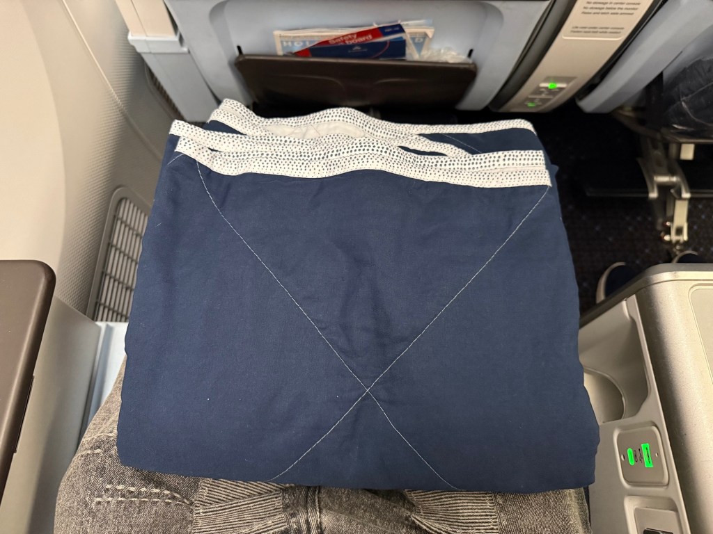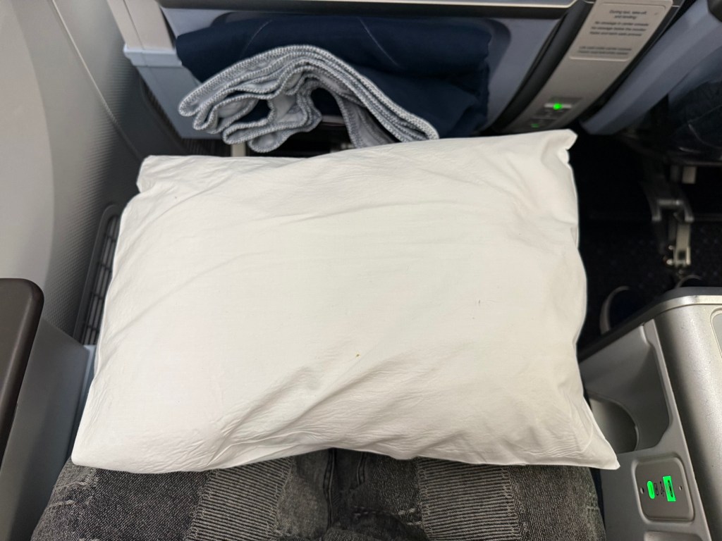 Waiting at my seat were a number of amenities, and some others were brought to me later during boarding. At the seat were a cozy blanket, quite substantial in size and clearly thicker and softer than the blankets in economy. The pillow, however, while better than economy, was still a little thin and smallish.