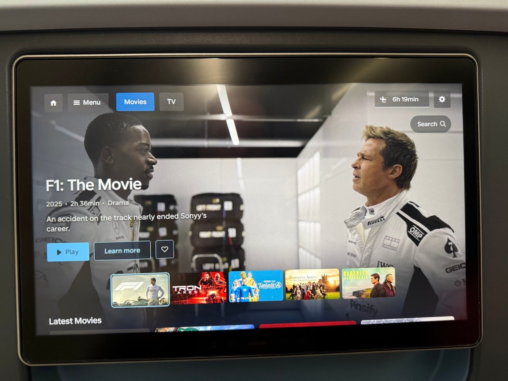 The 13.3″ entertainment monitor is right in front, which is the same size as you’ll find in Singapore Airlines and SAS bas well, and I found them perfectly sufficient. I do admit they seem a little small in the large physical form of the seatback. They were high definition and bright. They screens also pop out along the top side, which is great when the passenger in front reclines. This way you can still look straight onto the screen.