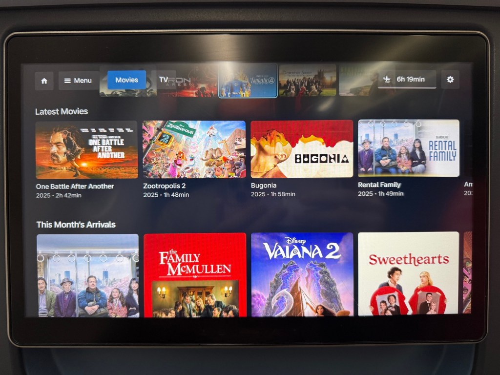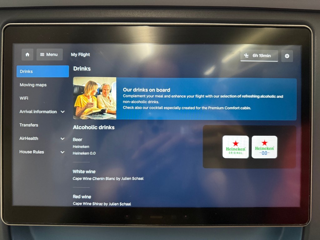 Premium Comfort has entertainment monitors that are 13.3″, bright and high definition. These are touch screens that I found are responsive and easy to use. When you first board you’ll see the welcome screen showing your seat, destination, and giving several language options. Choosing a language brings you to the home screen, which adds a menu button in the top left corner as well as a quick link to flight information, then a bunch of quick access buttons to the various entertainment options, and there is a graphical representation of the flight in the bottom with descriptions of the various flight stages.