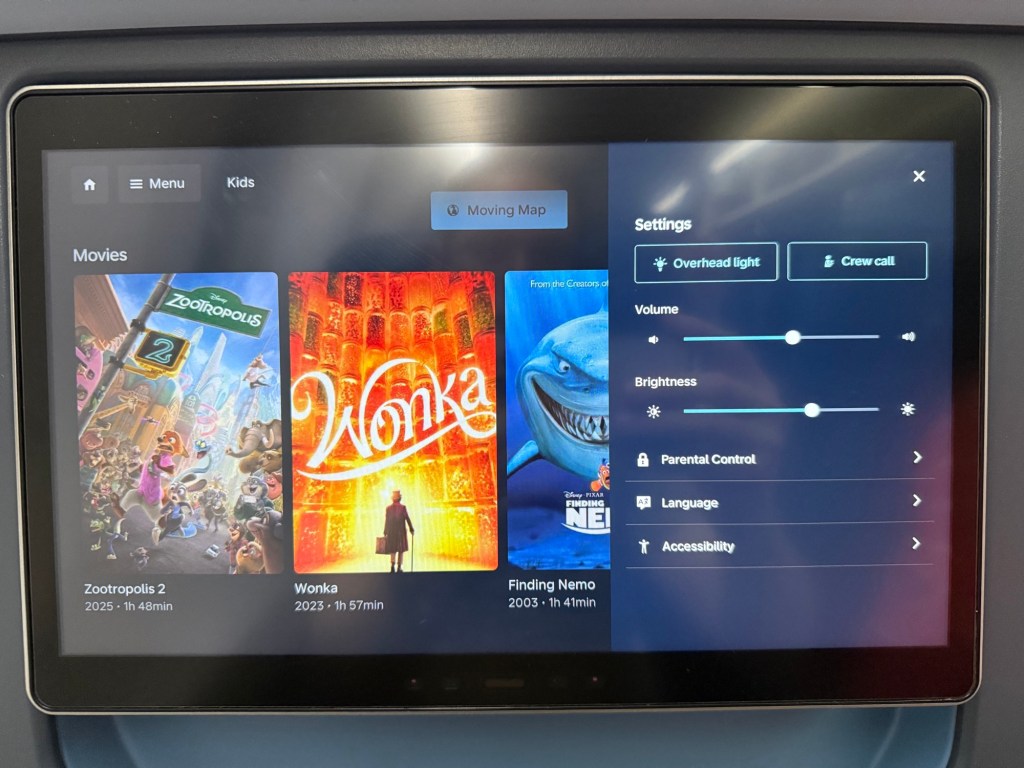 The menu button in the top left provides access to all parts of the entertainment system. As you can see there’s movies, TV shows, music, games and a bunch of other things. Choosing the gear icon on the top right opens a settings pane that controls lights, screen brightness, provide a crew call button, and has some links to change language and such.