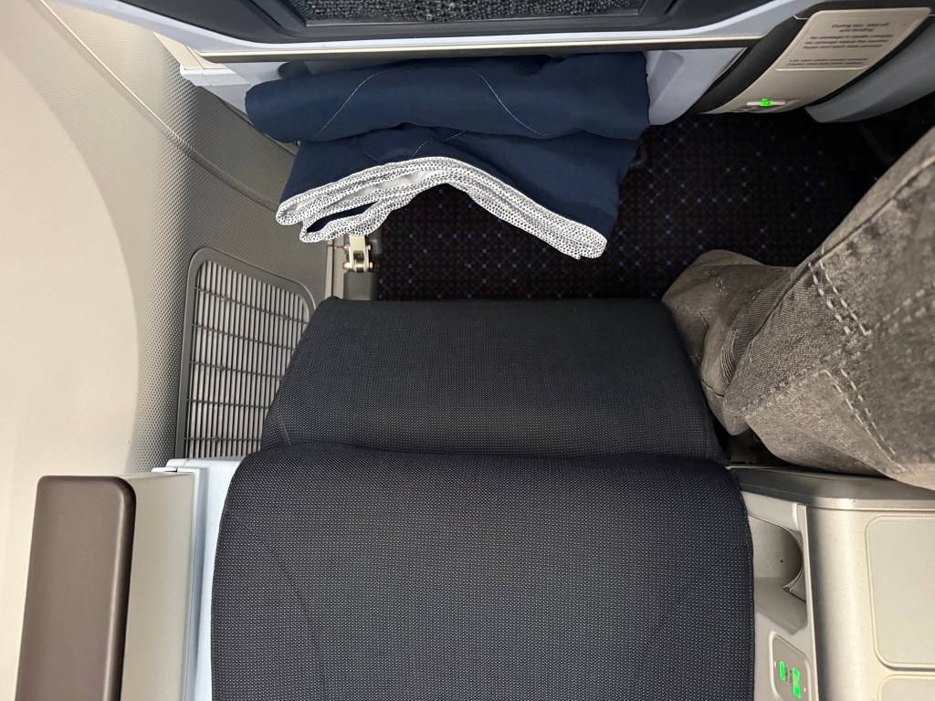 At the seat were a number of amenities, which I’ll get to in a moment. I assigned myself seat 12A, the window seat in the second row on the left side of the plane. I thought the seat was quite spacious and comfortable. While the width is only half an inch more over economy, the seat feels substantially wider: I think it’s because the armrest on the left side (or right side if you’re on the aisle) is actually thinner than the top of it would suggest, so you have an extra centimeter or so because of that. That extra space is likely not included in the 18.5″ width that’s advertised, so I imagine the true width is more like 19″.