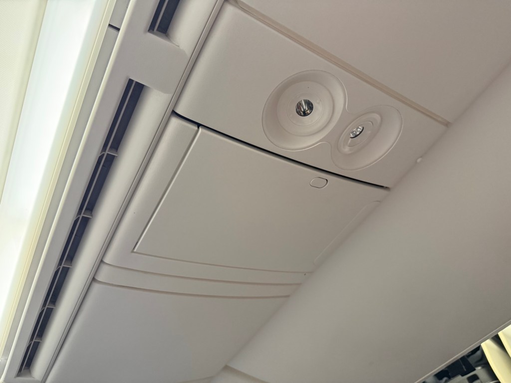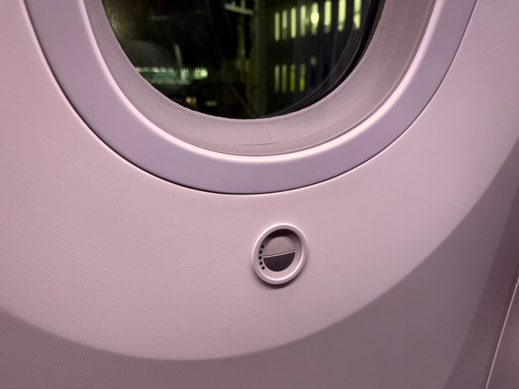 Unfortunately, as seems to be more and more of a standard across many airlines, there are no individual air nozzles in any cabin – including premium economy and economy. And since this is a Boeing 787, there are no window shades, rather there are dimming controls below the window.