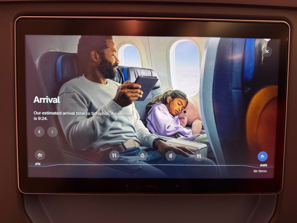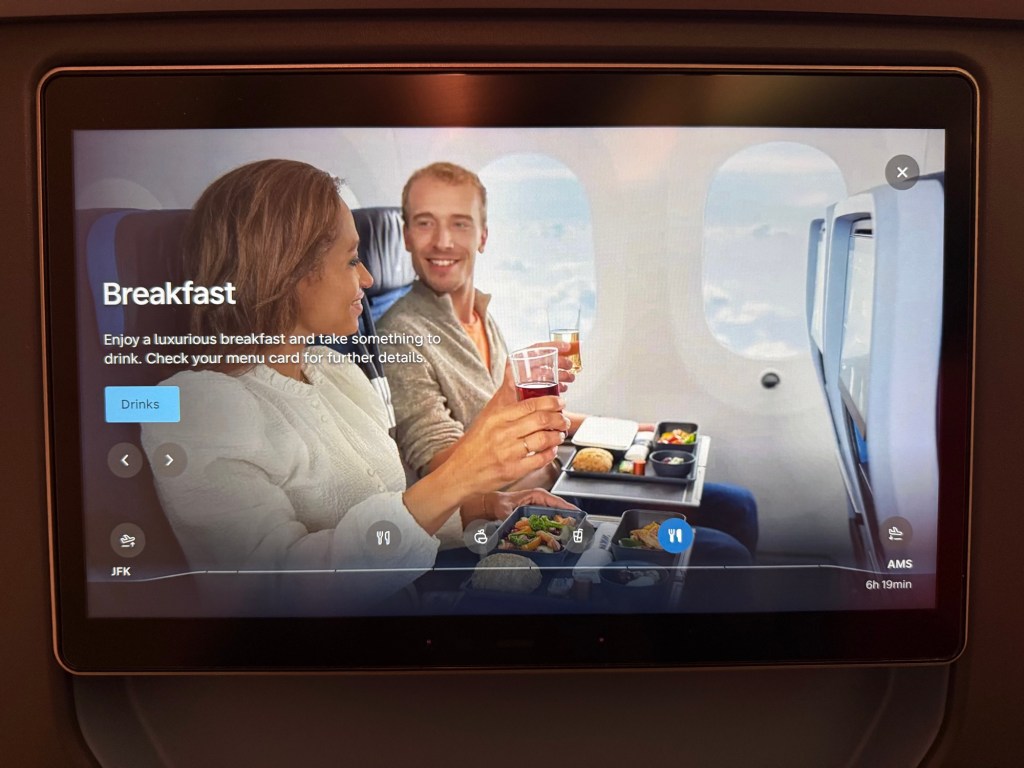 I must have merely rested my eyes for the first hour or so, but I distinctly remember suddenly waking up to a bright light and breakfast service about to start, with only 1 hour and 26 minutes still to go to Amsterdam. While it’s difficult to get more than a few hours sleep on a short red eye flight like this, I still must have slept about 2-2.5 hours or so, which is not too bad for me.