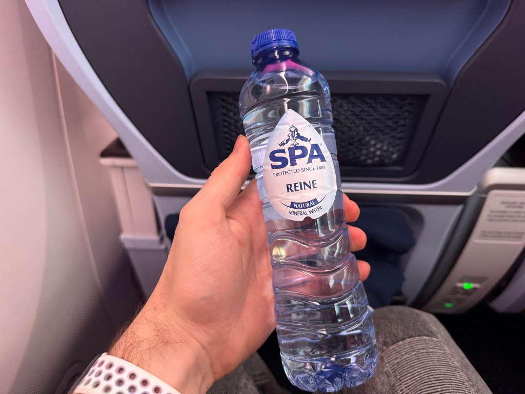 Then there were several things that were brought out and distributed during boarding and closer to departure. First of these was a bottle of water. The brand is nostalgic to me – Spa, a Dutch brand of spring water. The fit perfectly into the cut-out at the front under the center armrest. I thought that was a very thoughtful design decision.
