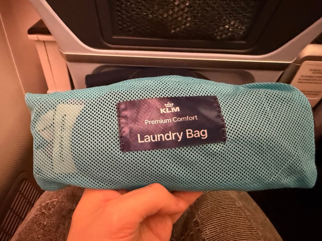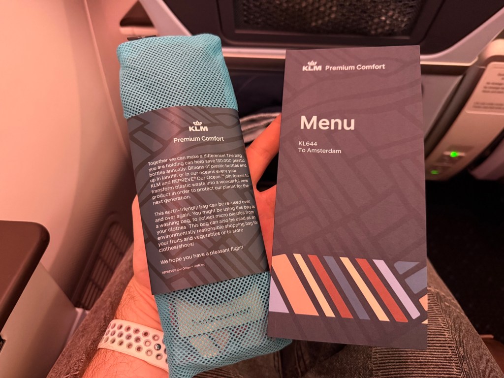 Soon after menus and a small amenity kit were also distributed. To look at the amenity kit first, KLM differentiates itself by its practical vision of amenity kits. The business class amenity kit was a reusable bag, for example, and the Premium Comfort kit has a similar practical use: on the bag was a label indicating that this was supposed to be used as a laundry bag. I thought it’s a little small for that, but I appreciate the idea. In it were an eye mask, a pen, ear plugs and a dental kit. All in all, a nice set of items that should help getting comfortable.