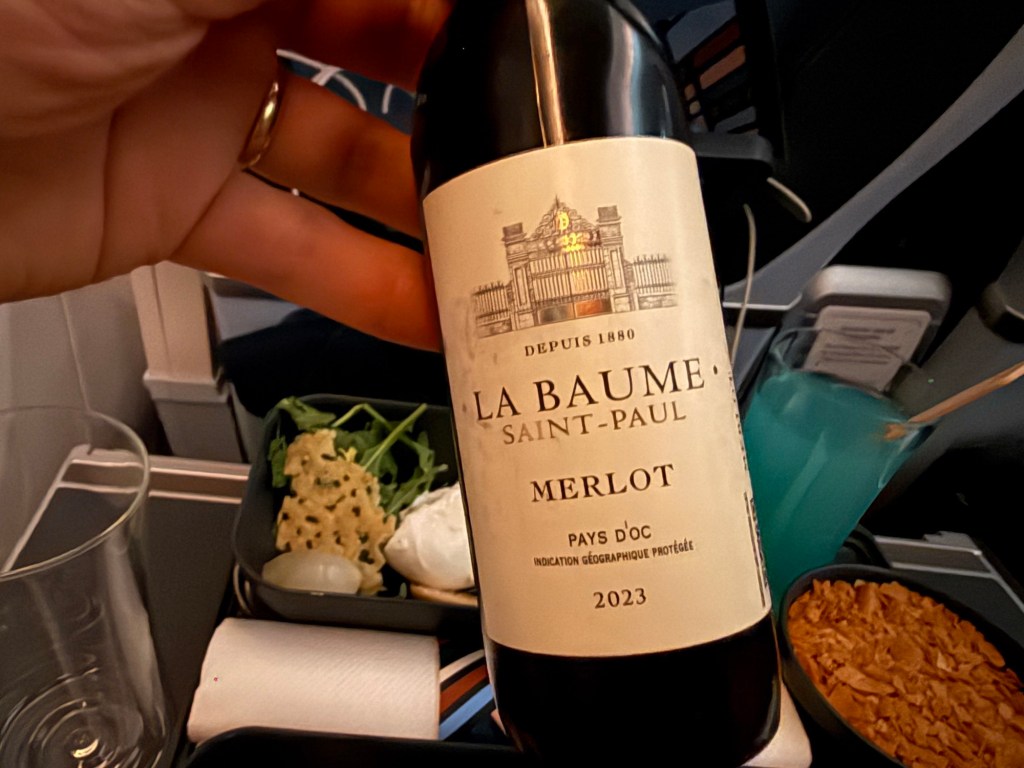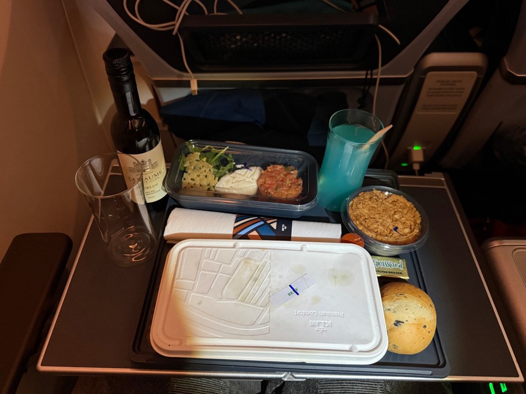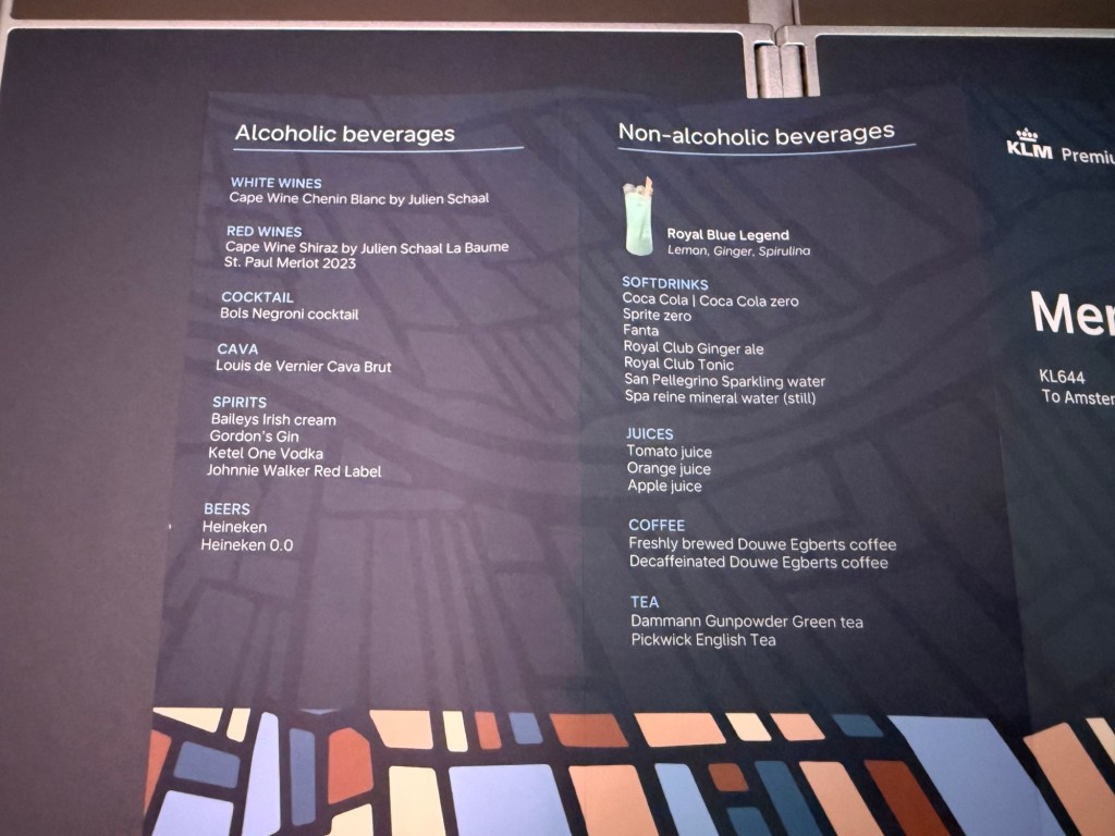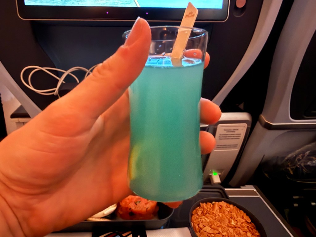 In terms of non-alcoholic drinks, for a little while now KLM has had a blue mocktail on offer in business class, but I didn’t realize this was available in Premium Comfort as well! I was delighted by that as I remember having it before on my flight in business class from AMS to JFK in 2024. I much enjoyed it back then so I decided to have that in addition to the wine. Despite the fact that blue perhaps isn’t the nicest color for a drink, I find it a tasty and pleasantly refreshing drink.