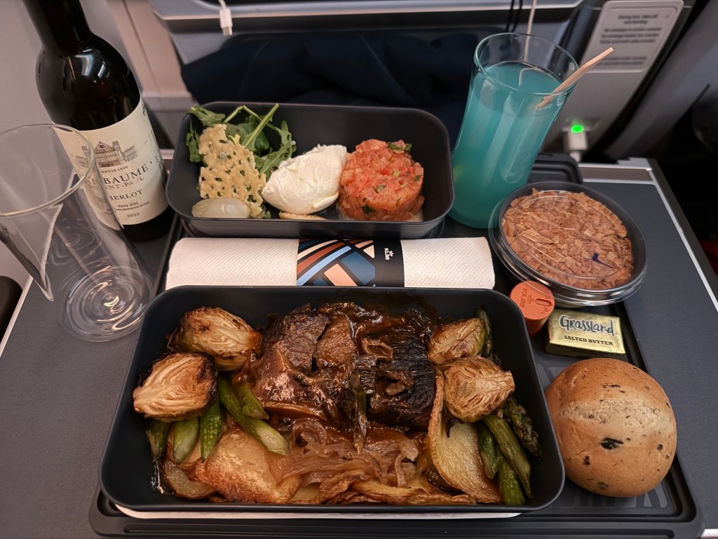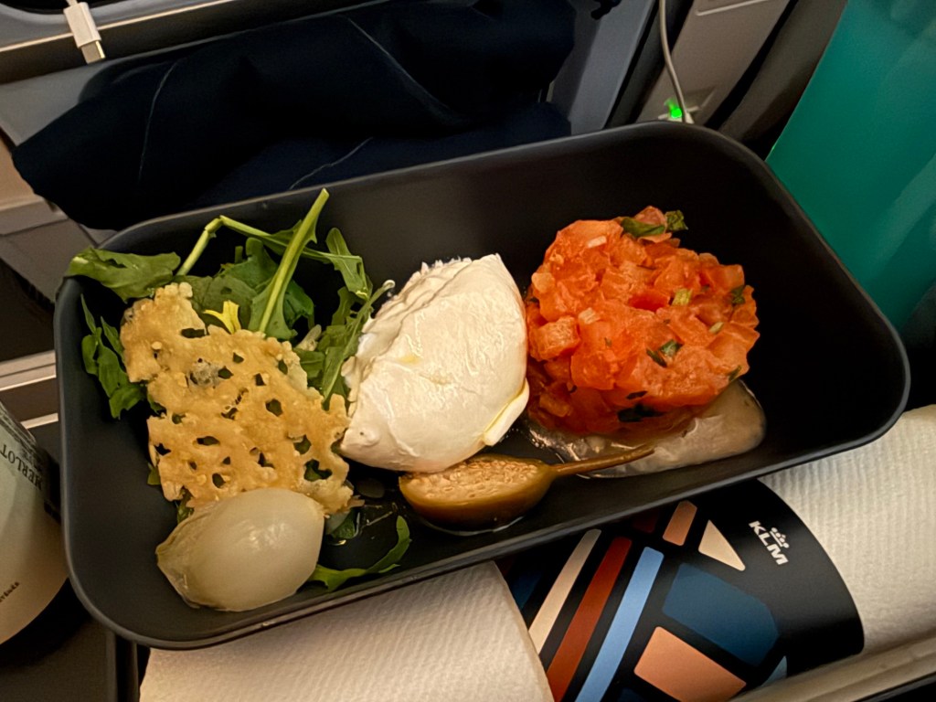 I gotta say, I really enjoyed the provided meal on this flight. While it’s not as nicely presented as a business class meal, I’m not sure that the food I had in business class was significantly better than what I had here in Premium Comfort. On the other hand, the food was clearly a big step up from the economy meal that KLM provides. The food was a good size portion that left me satiated, and it tasted pretty great. The beef was delicious and cooked well, with good-quality ingredients. I also liked the fresh tomato salad/tartare and much enjoyed the dessert.