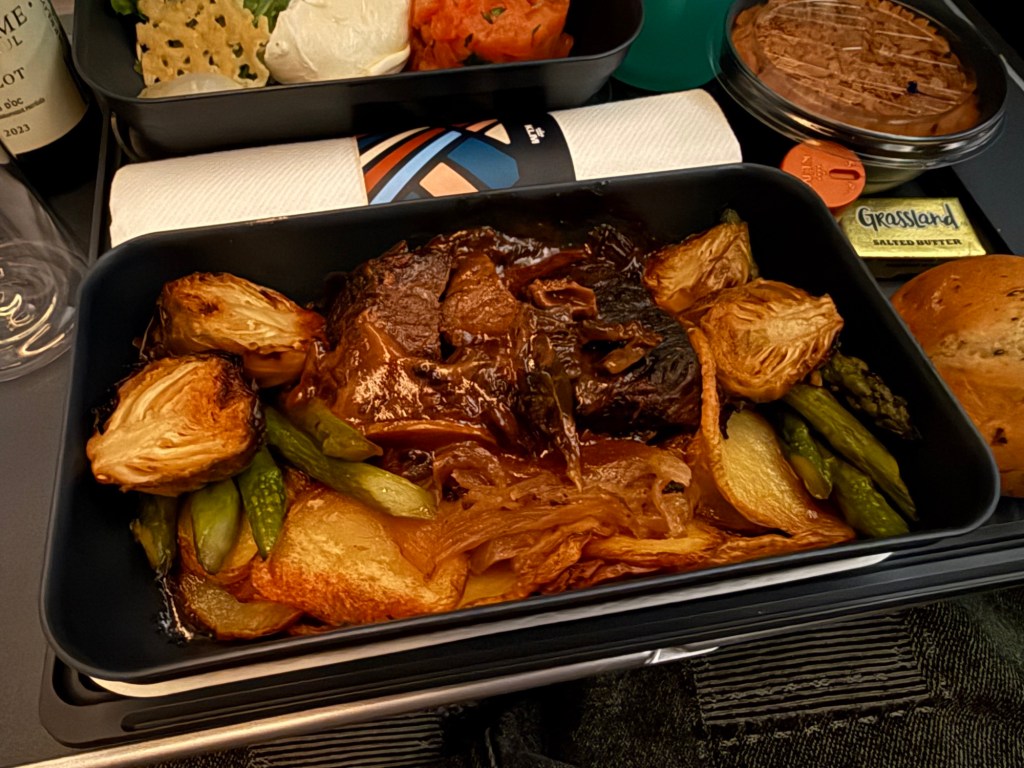Be that as it may, the friendly flight attendant asked what I’d like to eat and I selected the slow-cooked beef. This was paired with the appetizer and dessert, all on one tray. At first glance, the tray seemed kind of small, and reminded me how big the tray had been in Singapore Airlines. But with that said, the sizes of the various dishes looked pretty good and seemed to represent a good portion of food overall. Removing the covers off everything, the food underneath looked great!
