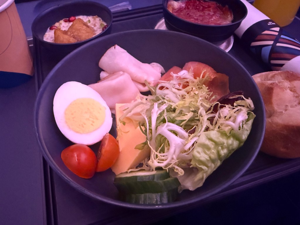 As for the food itself, as you can see there was something of a main consisting of vegetables, cheeses and cold cuts, and two sides, including a chia seed pudding and a warm pancake. Truth be told, this was incredibly similar to what I was served in business class back in 2024! I would say that everything not only seemed similar but the taste was near identical. Clearly the business class breakfast was served a bit more nicely, but if you’d swap the plasticky dishes with porcelain and serve it on a bigger tray, it would be exactly the business class breakfast.