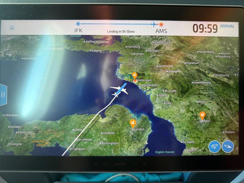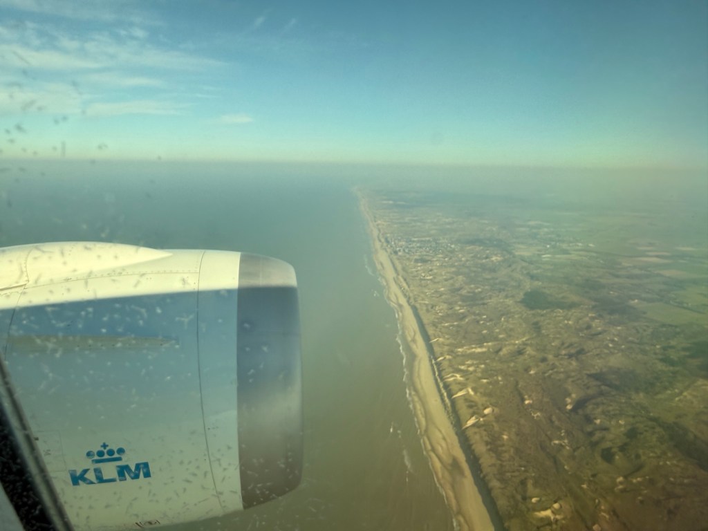 By the time breakfast was cleared off my tray table, we had about an hour to go. I spent that time watching another movie, and staring out the window. At about 25 minutes prior to arrival, the pilot was back on the PA to announce that we had already begun our descent and would be landing soon, and some information on our gate and the weather in Amsterdam. It appeared like it’d be a pretty sunny day. It wasn’t much longer until we crossed the Dutch coastline.