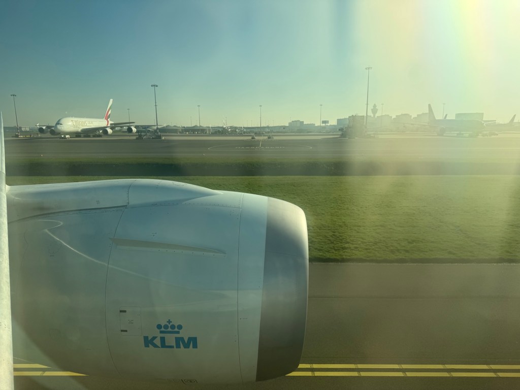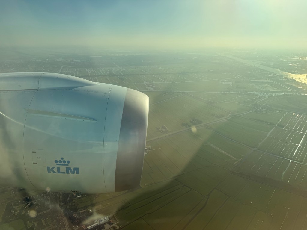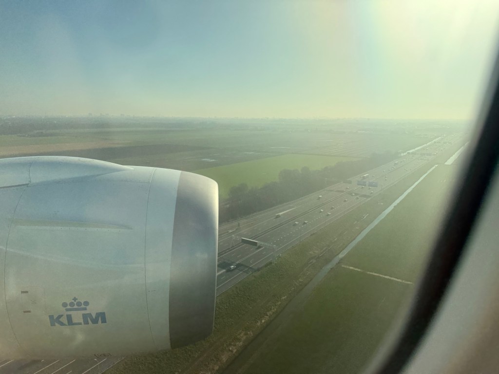 As we continued our descent towards Schiphol Airport, I was glued to the window, staring out over my home country and its fields, water ways and roads that make up the stereotypical Dutch landscape. Clearly it was quite humid, as the windows got rather fogged up on approach to the runway.