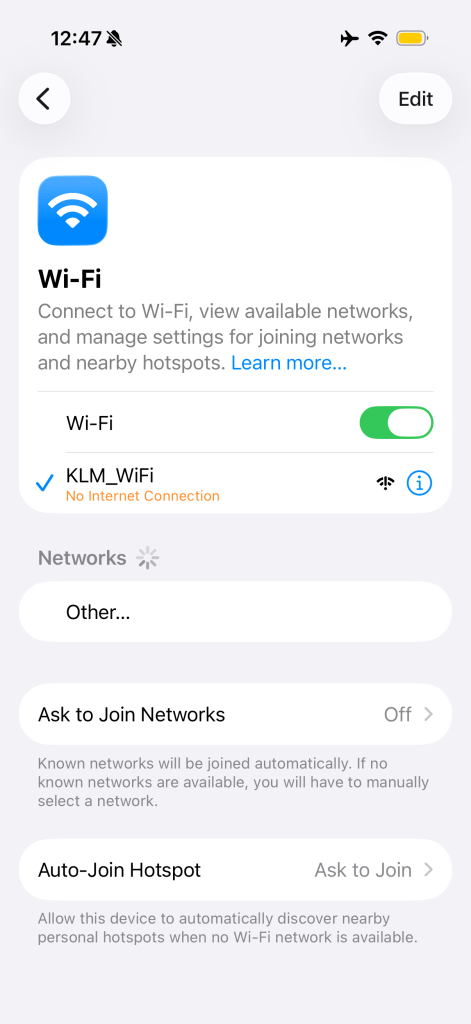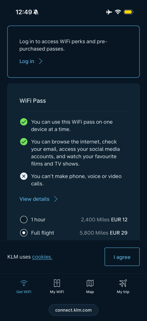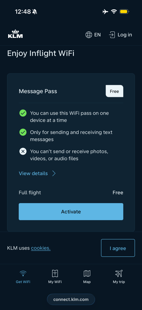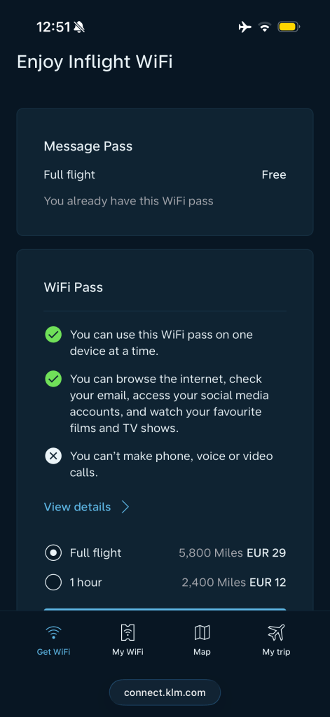 Finally, there’s also WiFi onboard. I had reviewed this in past reviews, with varying success. this time I was able to connect. You open the WiFi settings pane, select ‘KLM_WiFi’ and wait for connection to be established. This will prompt Safari to open, where you’ll have the option to get one of several WiFi passes. Messaging is free, but anything more than that will cost you some.