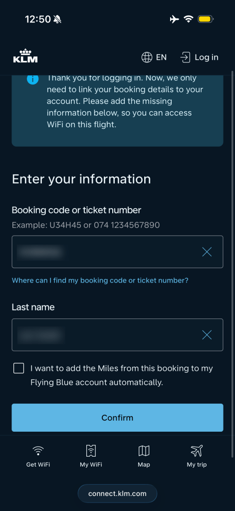 It’s possible to login with your Flying Blue account for automatic recognition of your flight details, which may grant you a free pass (or something). This wasn’t particularly smooth as any time I filled out any fields and hit submit, it would load indefinitely until I reloaded the page – then it seemed my selections had already been processed but just weren’t displayed. As you can see, logging in automatically provided me the Message Pass (which is free anyway).