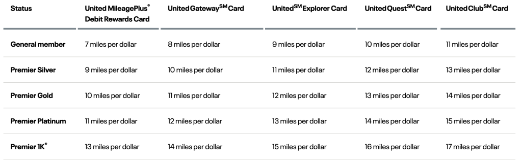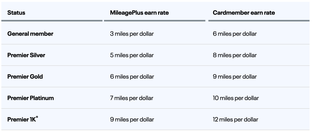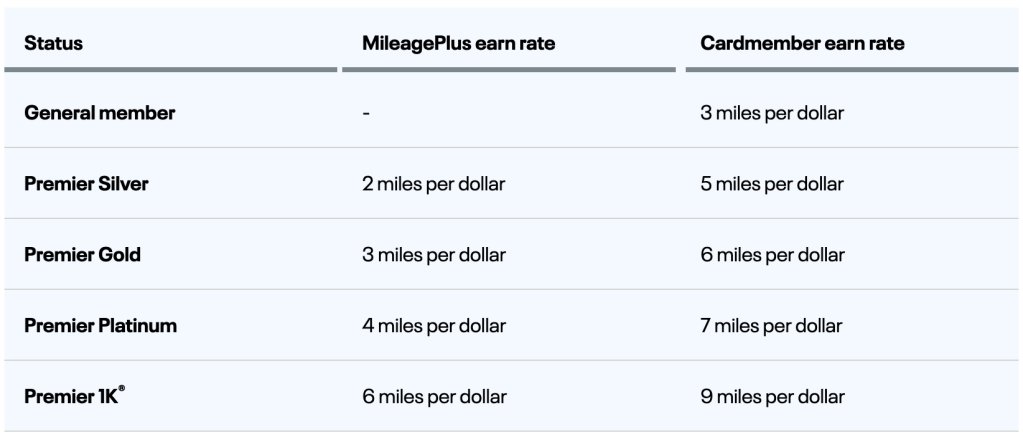 - Having a credit card increases your earn rate by a flat 3 miles/dollar. As such, card holders at every tier will earn 1 mile/dollar more than before. Note these extra miles are earned for just having the card – if you’d also use the card to pay for the flight, you’s also earn the extra miles for putting spending on the United credit card.