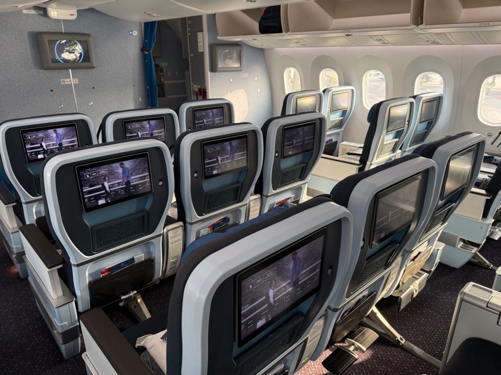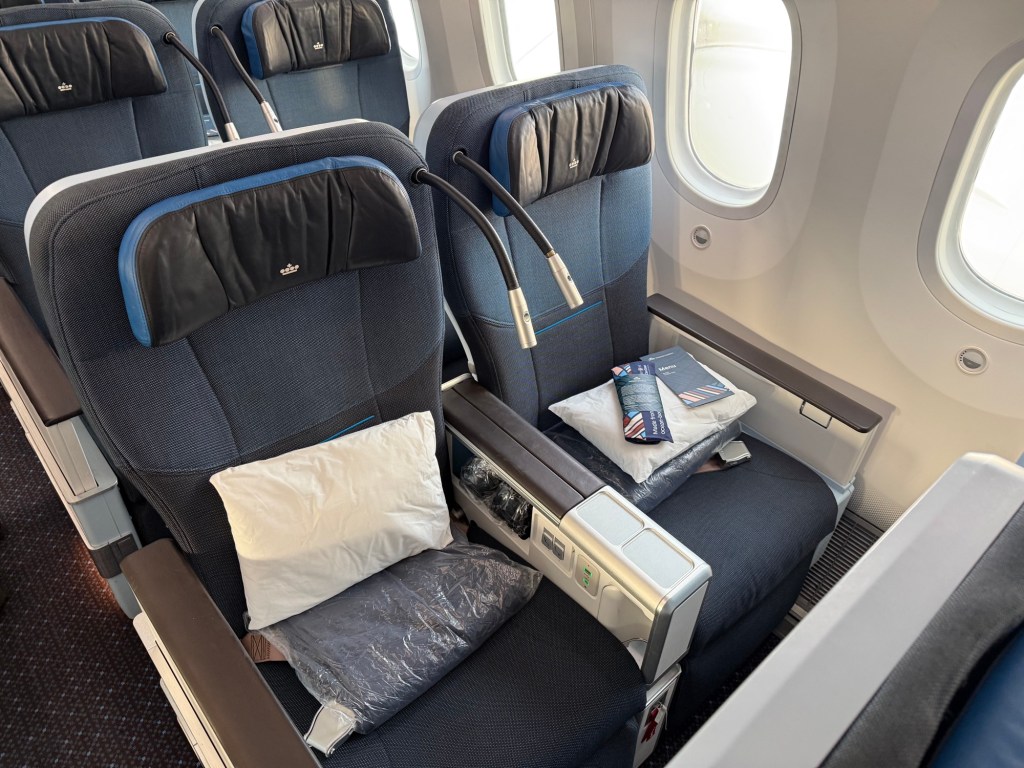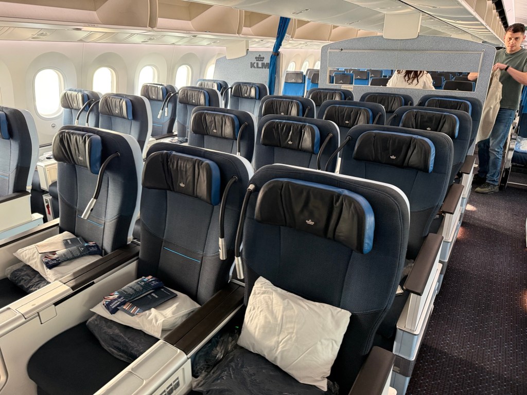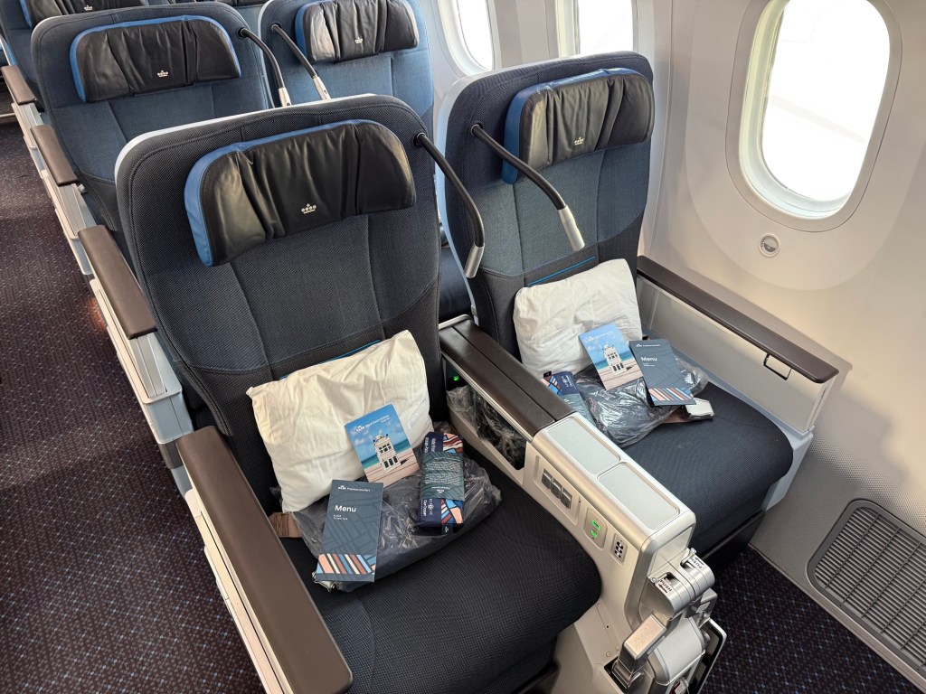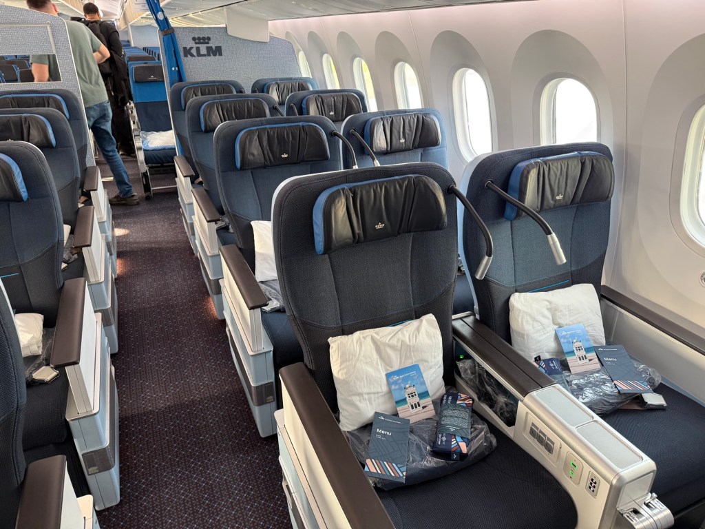 As a reminder, KLM’s Premium Comfort is in a 2-3-2 configuration and features the Collins Aerospace MiQ seats, with 38″ pitch, 18.5″ width and have a good recline of 8″. For comparison, KLM’s economy seats have 18″ width and a 5″ recline – though the extra-legroom ‘Economy Comfort’ seats have a 7″ recline. With US airlines, these are popular seats for the first class cabin, so it’s worthwhile to make the point that what’s considered ‘first class’ for a domestic configuration, ends up being ‘only’ premium economy on the average long haul flight.