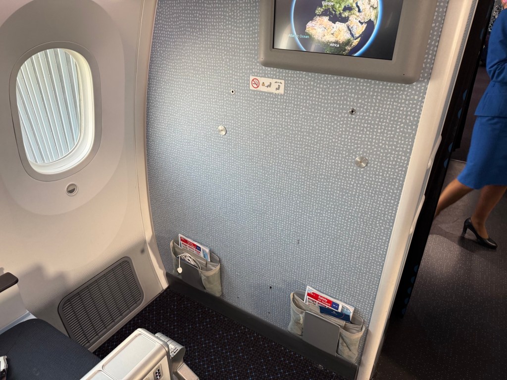 Here’s seats 12A and C, which I was in on the flight to Amsterdam, as a comparison. As you can see, with a seat in front there’s less legroom, but you do have immediate access to the TV screen and there’s a little more space to store things, for example in the pouch right below the TV screen. I definitely missed that extra storage space in the bulkhead seat.