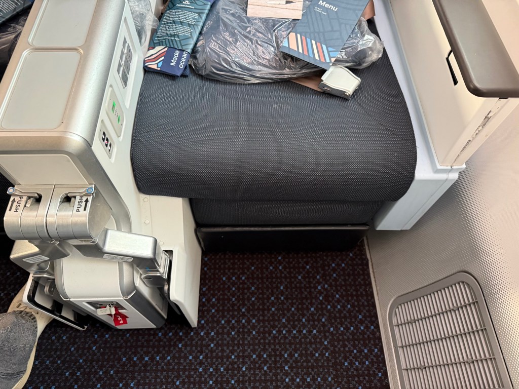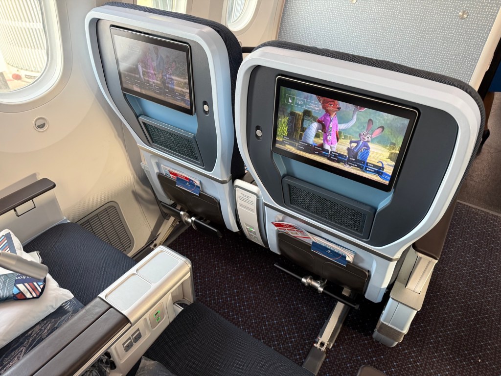 Since I was seated in the bulkhead, that meant I had a substantial amount of legroom. This is why I generally like the bulkhead seat over the other rows. However, that also means there is a little less storage space and the TV screens come from under the middle arm rest. These have to be stowed for taxi, takeoff and landing, meaning you can’t watch anything until after takeoff and ill have to stop early, before landing.