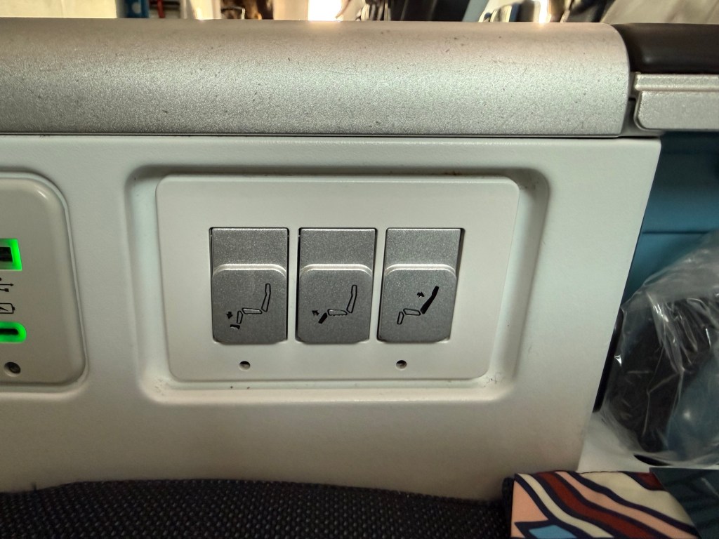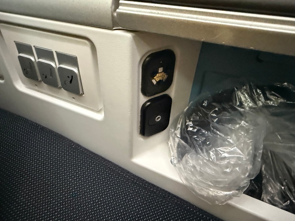 Then, normally there is a small compartment at the front of the armrest that would store a bottle, but here it is absent and replaced by crew call buttons. Normally you’d access these through the entertainment system, but since you have to stow it during taxi, takeoff and landing, you can’t; as such there are physical buttons for these functions.