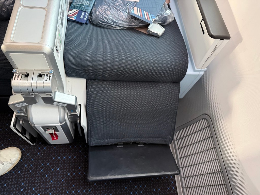 Between seats 11A (this flight) and 12A (the previous flight), the differences are small. The main ones are in the center armrest, and are related to the fact that there is no seat in front. Number one is that rather than two buttons to control the leg rest and recline, there is a third button to control the footrest. As you can see, on the bulkhead seat it’s attached to the leg rest, rather than being placed on the seat in front (though the button for it didn’t seem to work).