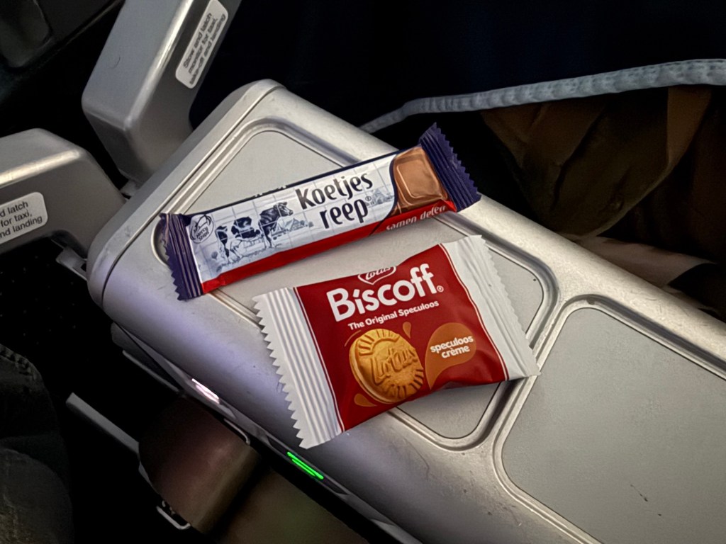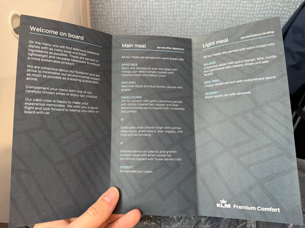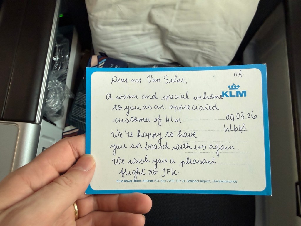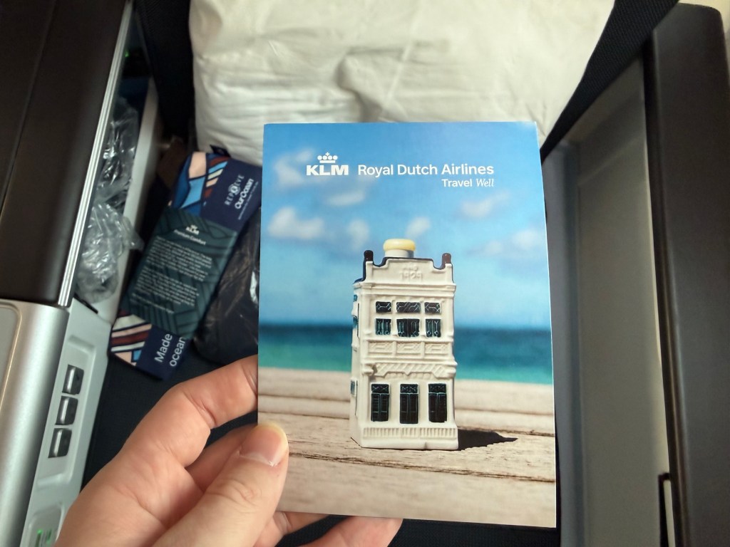 Among the various amenities at my seat, all of which I have reviewed before, there was one standout item I hadn’t seem before: a postcard of one of KLM’s signature Delft Blue houses, normally provided as a parting gift in business class. On the back there was a kind message welcoming me personally on board and thanking me for my loyalty! I was pleasantly surprised and thought this was such a nice gesture. Thank you, KLM!