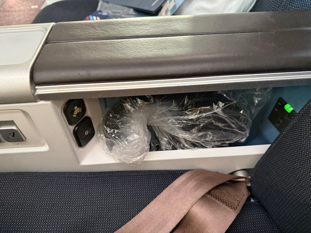 The rest of the armrest is more or less the same, and includes a storage compartment that, upon boarding, holds noise canceling headphones. On the front side is the plug for the headphones, and in the back is a universal power plug.