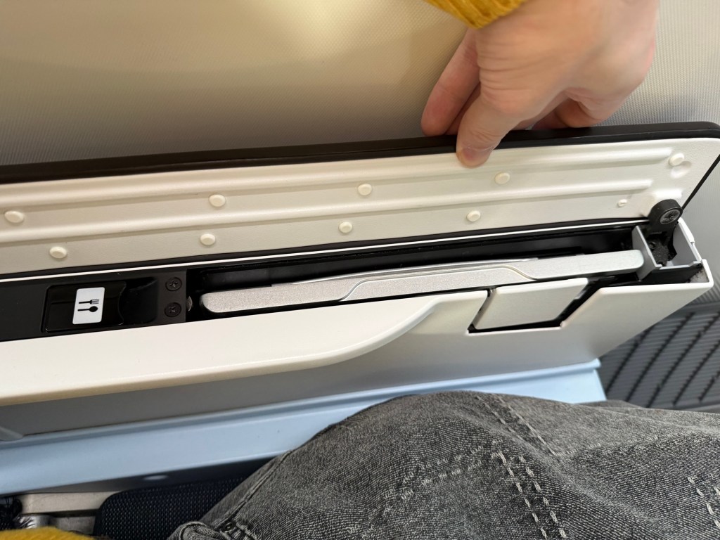 The tray table is under the left armrest if you sit by the window. If you sit on the aisle, it will be in the right armrest. This is no different then on the other seats, but I did notice that here there is a little cutlery sign to the left. Pulling on that will release the tray table so you can unfold it – that sign was missing on my flight to Amsterdam.