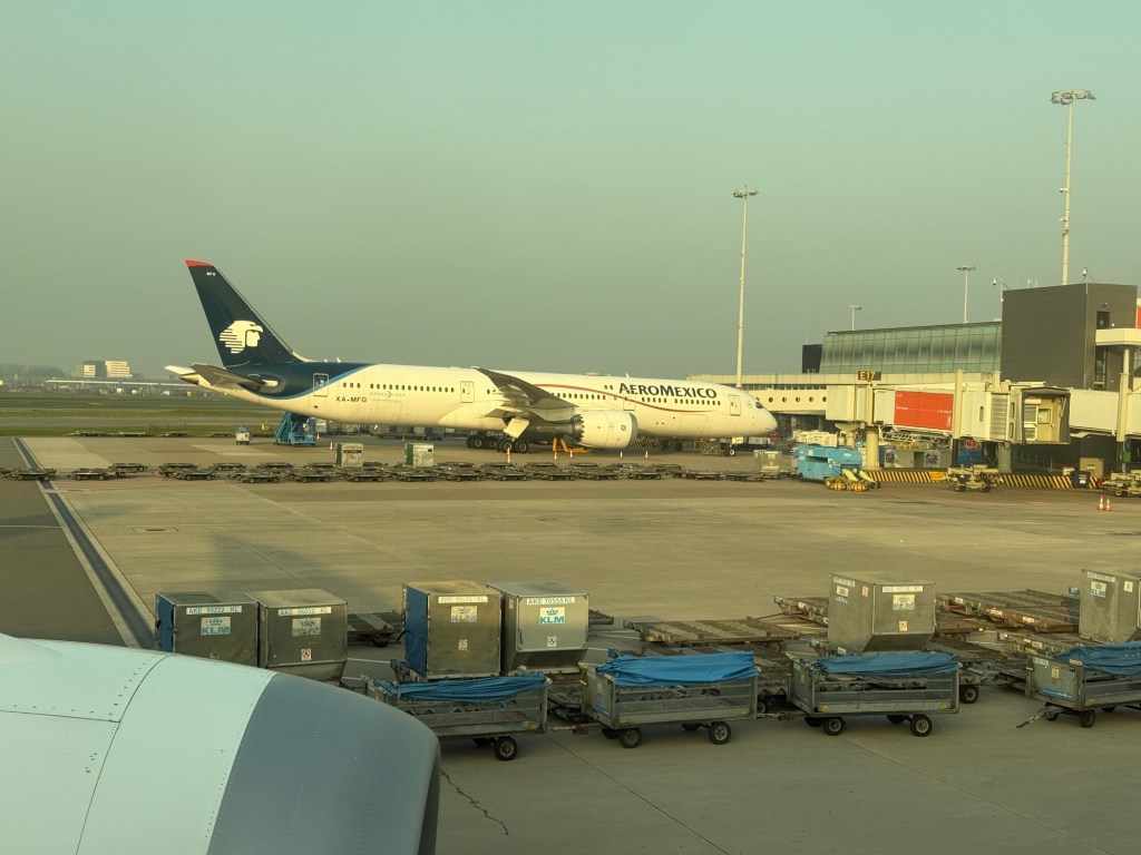 Boarding overall was very smooth. It started about 50 minutes ahead of departure, and to my surprise it was very calm at the gate. Throughout the boarding process, people trickled in. Indeed, I later saw that the flight was probably half empty. We ended up pushing back at 5:13pm, 8 minutes behind schedule. We had a good view of an AeroMexico Boeing 787 as we pulled out of the gate.