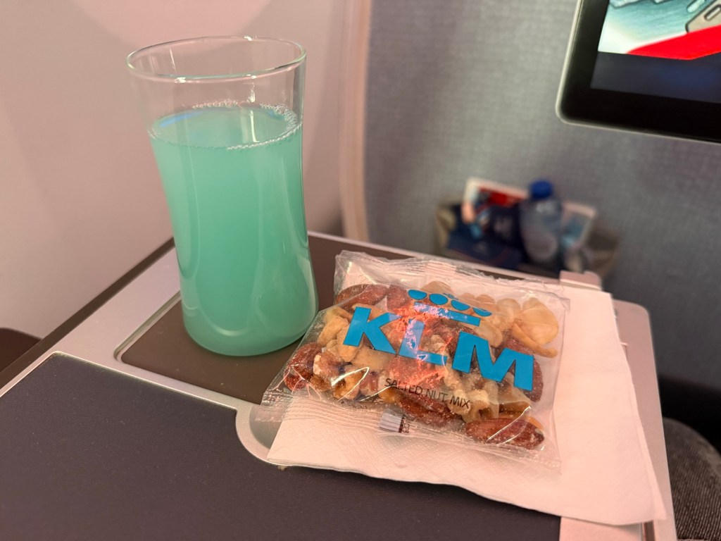 Before dinner was brought out, there was a pre-dinner drink service, which was accompanied by a KLM-branded bag of mixed nuts. This was the second change from the redeye flight, and something I was quite happy about. I do like to have a true drink service to settle in and hydrate a little before the dinner starts in earnest. As you can see, I took KLM’s signature mocktail, which is very refreshing.