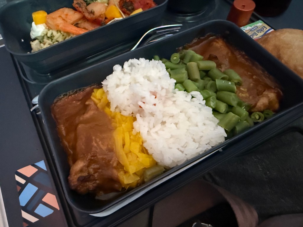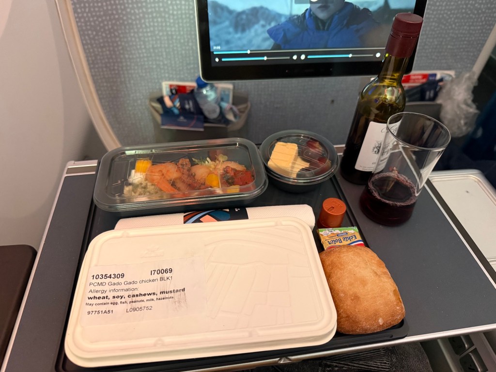 I thought it turned out to be a great meal. I liked the pre-dinner drink service, the additional choice in main course, and the dessert served as a separate course. The food tased very well, and I particularly liked the shrimp and Gado Gado chicken. throughout, I thought the flight attendants were attentive and kind, and happy to provide more drinks and such.