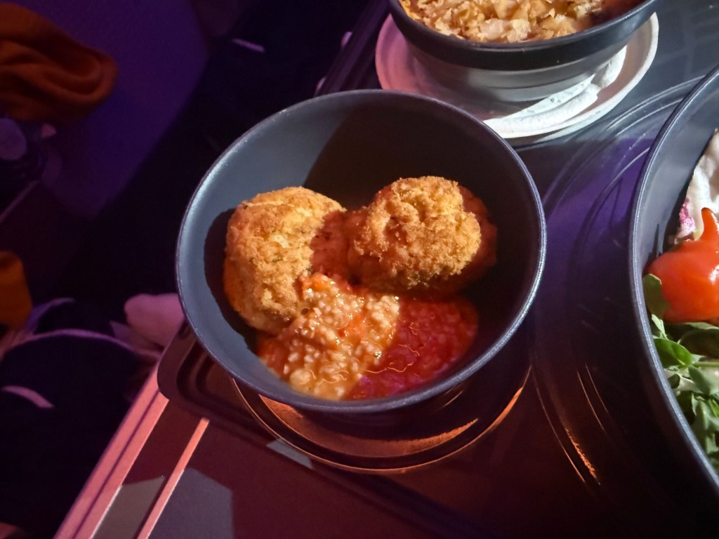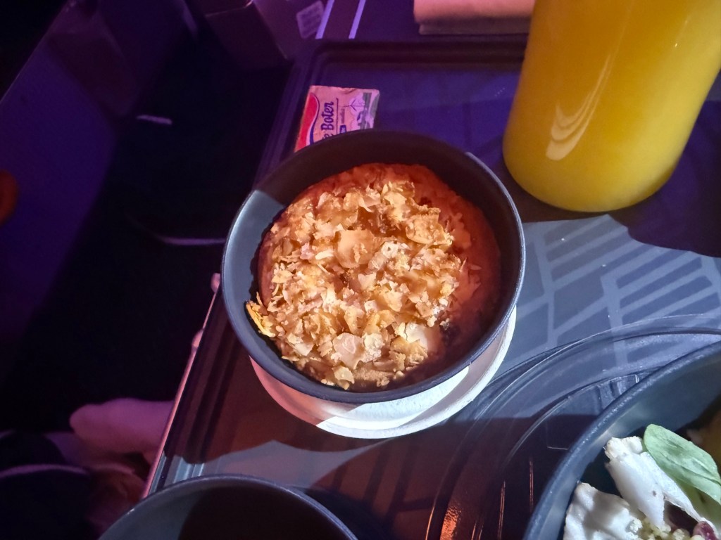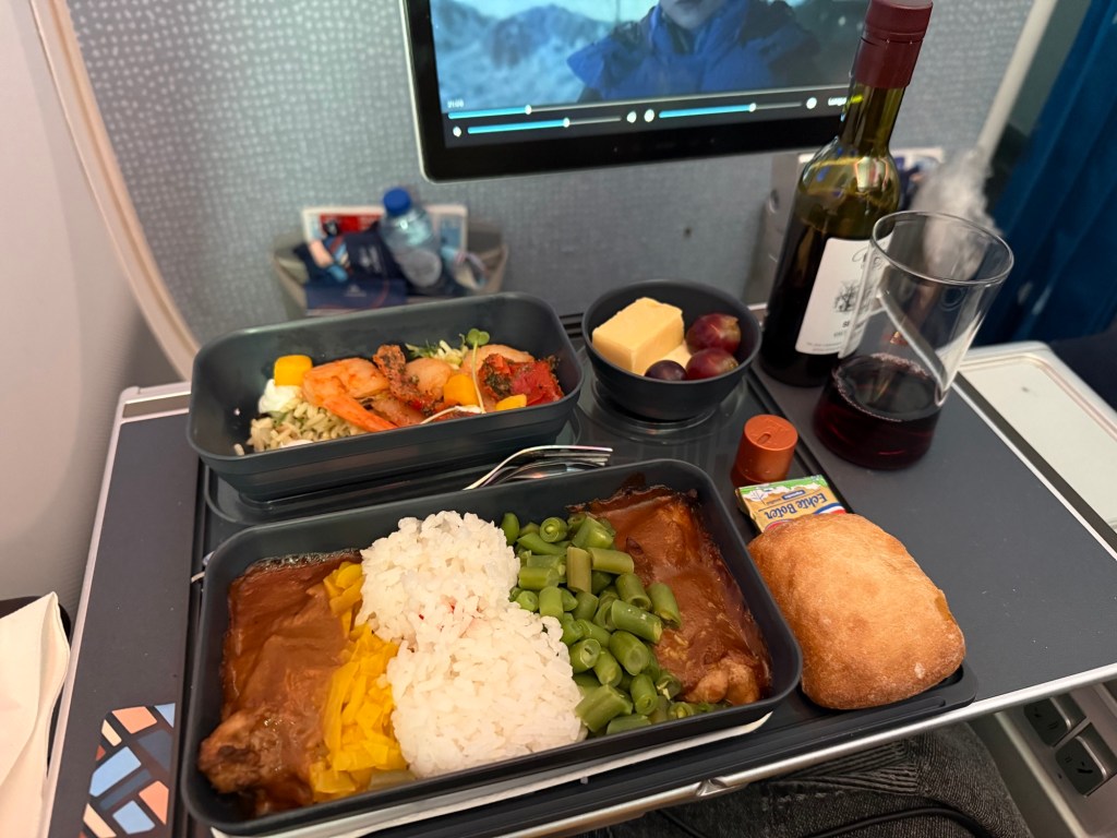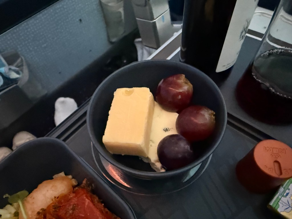 I have highlighted most differences between the redeye and day flights, but just to put it all in one place: there was a pre-dinner drink service, an extra main at dinner, and a separate dessert course. There were also additional drinks and snacks brought out during the flight.