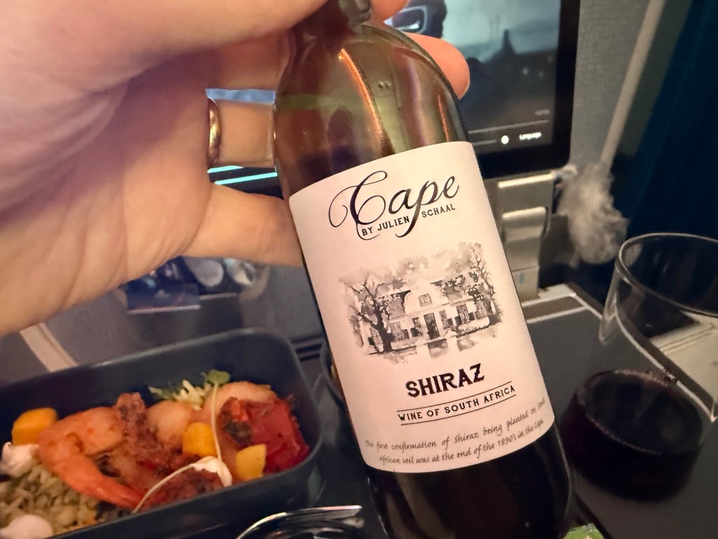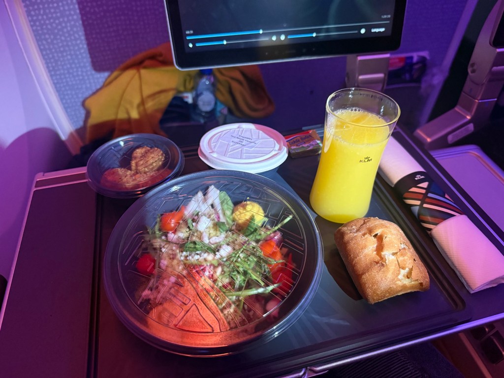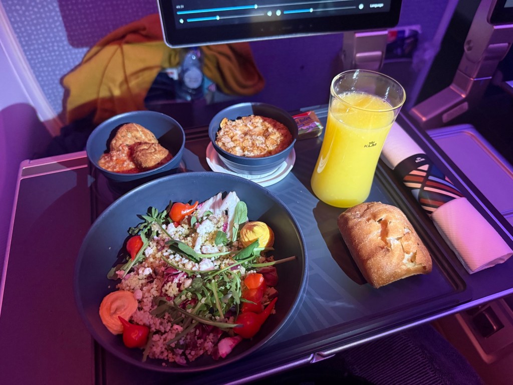 For dinner, I chose the Gada Gado chicken with cashew satay sauce. This is an Indonesian dish (Indonesia used to be a Dutch colony, and Indonesian dishes feature prominently in the cuisines you can find in the Netherlands), which was filling and flavorful. Also, I love any kind of satay or peanut sauce… I paired this with KLM’s Cape Wine shiraz, which was surprisingly delicious.