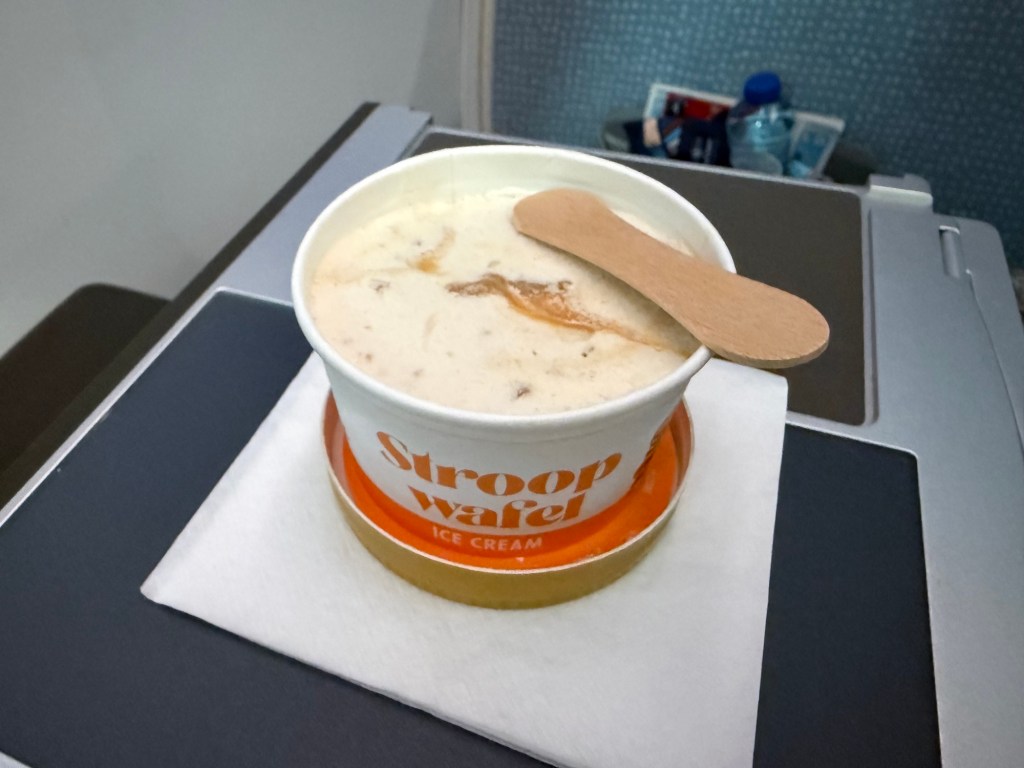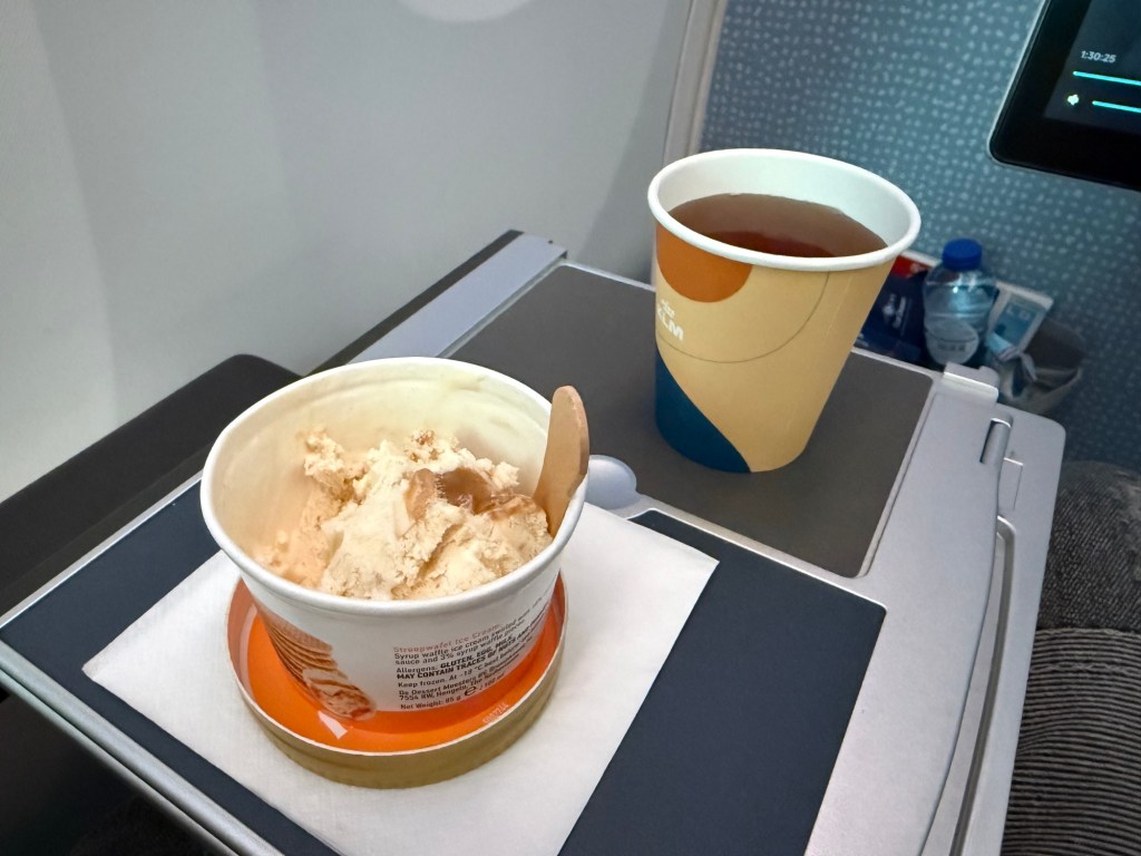 You may have noticed the lack of a dessert. While the main meal was cleared around 6:20pm, a dessert course of cie cream was brought quite a bit later, around 7:08pm. This was accompanied by a warm drink. Note that drink refills were provided throughout the meal service as well, and I did ask for more of the KLM mocktail. At dessert I switched to a cup of tea, which was unfortunately served in a paper cup, rather than a proper earthen mug.